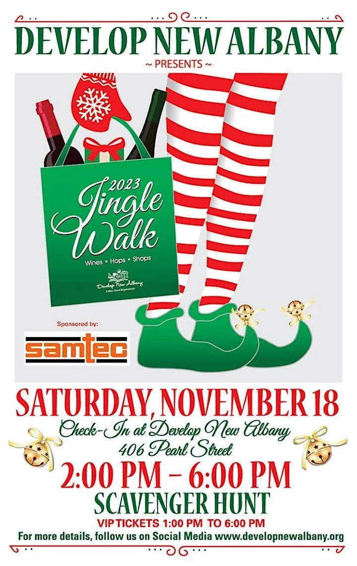 Develop New Albany, Jingle Walk Saturday, November 18, 2023 1:00 PM 5:00 PM Wine Shop 410 Pearl St New Albany United States (map) Google Calendar ICS Champagne Toast to kick off the walk!Check in for the walk at 406 Pearl Street (Develop New Albany Office), and then follow the velvet ropes to the Wine Shop for a champagne toast to kick off the day of delicious wines and local shopping! Tickets